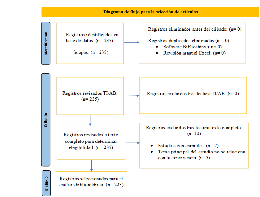 Tras la aplicación de la ecuación de búsqueda en Scopus se han recuperado un total de 235 registros de tipo artículo. Para la identificación de duplicados se utilizó el software Bibliometrix mediante la interfaz gráfica web Biblioshiny, que al importar los datos ejecutó una búsqueda automática y de forma complementaria se realizó una revisión manual en Excel. En ninguno de los casos se identificaron registros duplicados. En la fase de cribado se revisaron los 235 artículos por título y resumen. Posteriormente se realizó la lectura a texto completo para la aplicación de los criterios de inclusión, 12 registros fueron eliminados por no ajustarse a los criterios de inclusión. De ellos, 7 eran de estudio con animales y 5 estaban relacionados con otros temas como las estrategias familiares de afrontamiento, el uso turístico o la regulación jurídica del cohousing. Finalmente, 223 artículos fueron incluidos para el tratamiento.