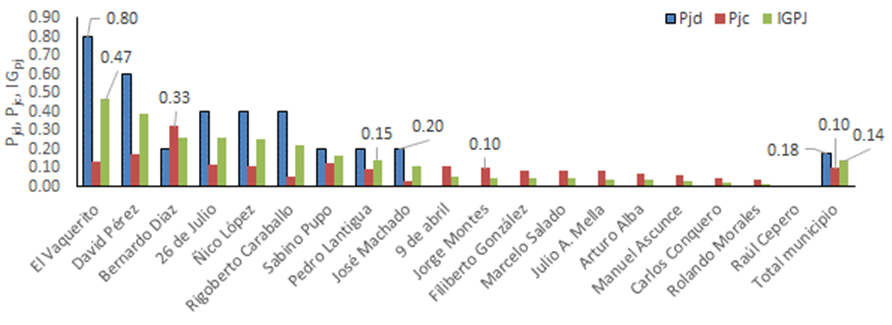 Se computan 9 Cooperativas (2 CPA y 7 CCS) con un índice general de participación juvenil (IGpj) superior al 10%; de ellas las de mayor índice son dos CCS El Vaquerito y David Pérez con un 47% y 39% respectivamente como puede observarse en Figura 1, nótese por ejemplo como en el caso de la primera cooperativa el IGpj es deteriorado por el bajo índice de participación juvenil en la cooperativa, a pesar de que haya una alta participación juvenil en la dirección, queda claro entonces que es preciso priorizar acciones para la incorporación estable de los jóvenes en la cooperativa.
