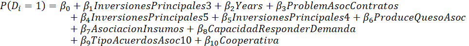 Por su parte, el hecho de que la asociación invierta en personal cualificado de manera significativa (InversionesPrincipales4), disminuye la probabilidad de obtener un precio por litro de leche superior a la media en un 87,8%. Esta inversión, que sería específica en recursos humanos (Ramos, 2006), muestra una relación contraria a la esperada, pero que podría tener explicación. Por un lado, se puede considerar que, si esta contratación se realiza con el fin de mejorar los procesos productivos en las fincas, probablemente el costo que representa para las asociaciones (que implicaría una mayor necesidad de aportes por parte de los asociados, disminuyendo el precio que reciben finalmente) superan a los beneficios que dicha inversión tiene. Por otro lado, considerando elementos institucionales de manera más específica, podría pensarse en la posibilidad en que, si bien esta contratación podría ser útil para mejorar el proceso productivo y la calidad del producto, esto no sea recompensado por parte de las procesadoras de leche, dadas las asimetrías de información existentes en cuanto a la calidad de la leche, así como a la estructura de mercado oligopsónica y a la condición de precio-aceptantes de los productores (Martínez, Pinzón, & Uribe, 2019).