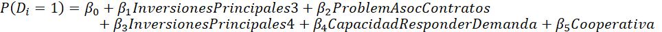 Además, se observa que pertenecer a una cooperativa disminuye la probabilidad de obtener un precio por encima de la media en un 53%.Si bien esto resulta curioso en un primer momento, debido a que los funcionamientos de cooperativas y asociaciones son similares, la mayor búsqueda de un impacto social, así como la pertenencia a un régimen especial, pueden implicar costos que no sean sencillos de identificar a simple vista, pero que terminan generando un menor ingreso a los productores por cuenta de aportes más altos. Por último, cuando se analiza la capacidad de responder ante aumentos de la demanda (CapacidadResponderDemanda), se observa que el hecho de presentar esta capacidad por parte del afiliado, aumenta su probabilidad de recibir un precio por encima de la media en un 29,8%. En principio, esta mayor capacidad productiva podría ser mejor aprovechada para conseguir un mejor precio promedio por litro de leche, cuando las contribuciones obligatorias a la asociación no son proporcionales al aporte en leche, sino que son montos fijos e iguales para todos.