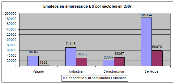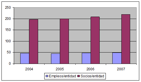 Del total de entidades de Economía Social en 2007, 25.714 son sociedades cooperativas (49,7 %) y 19.737 sociedades laborales (38,1 %) (considerando a las entidades de Economía Social en sentido amplio pues incluye mutualidades, asociaciones, y empresas de inserción social). En los últimos años, se ha producido un moderado incremento del 6,3%, 3.071 en valor absoluto, en el número de empresas de Economía Social. Sin embargo, el empleo ha crecido algo más y asciende a casi el 14% en el mismo periodo, lo que conlleva al aumento del número medio de empleados por entidad y que éste sea próximo a los 50 empleos en 2007. De igual modo, se han incrementado el número de socios en estos años y en consecuencia también crece el número de socios por entidad (220) (Figura 2).