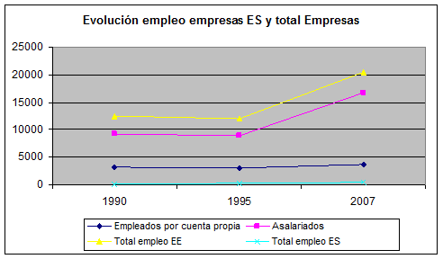 Tabla 2. Evolución del empleo en las empresas de ES (cooperativas y sociedades laborales) y en el conjunto de la economía española. Periodo 1990-2007.