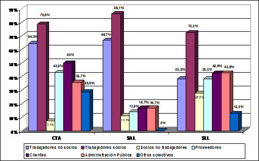 · En cuanto a los distintos tipos de socios y trabajadores se observa que el colectivo que participa en acciones de RSC, en un mayor número de empresas, es el de los socios trabajadores, lo que deriva de la propia naturaleza de las entidades analizadas, basadas en la doble condición de socio y trabajador. Los trabajadores no socios le siguen en importancia, lo que indica que muchas de las medidas aplicadas a los trabajadores socios se extienden a los asalariados mejorando con ello el clima laboral. Sin embargo, la importancia que se asigna a su participación en ambos tipos de trabajadores es bastante más reducida que la que se otorga a otros colectivos. Por su parte la participación de los socios no trabajadores es bastante más reducida especialmente en las SCTs en las que se trata de una figura casi inexistente.