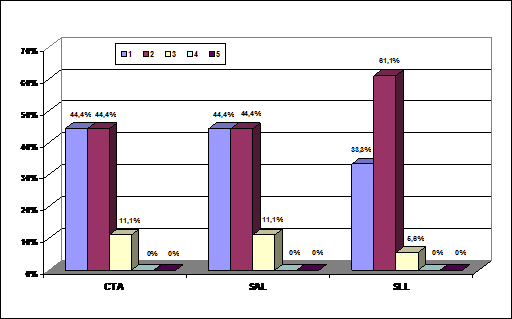 Analizando únicamente a las entidades que le otorgan algún valor a la RSC se observa que entre las distintas sociedades, tanto en las SALs como CTAs sólo hay, algo más de un 20 por ciento de las entidades que asignan una gran importancia a la RSC (entre los grados 4 y 5). Concretamente se trata del 30,77 por ciento de las CTAs y del 23,69 por ciento de las SLLs. Estos datos indican que sigue predominando una reducida valoración de la RSC, aunque se aprecia como un número considerable de entidades empiezan a concebirla como un elemento a tener en cuenta. La citada situación contrasta con el caso de las SALs en las que sólo un 2,78 por ciento de las entidades que valoran a la RSC lo hacen con un grado de importancia elevado.