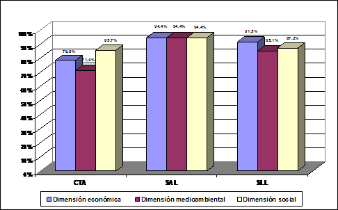 En cuanto al grado de importancia que asignan a cada dimensión, se observa que las dimensiones que preocupan a un mayor número de entidades (la económica y la social) son a las que se les otorga un menor grado de importancia. Así, cerca del 80 por ciento de las entidades le otorgan una importancia comprendida en los niveles 1 y 2.