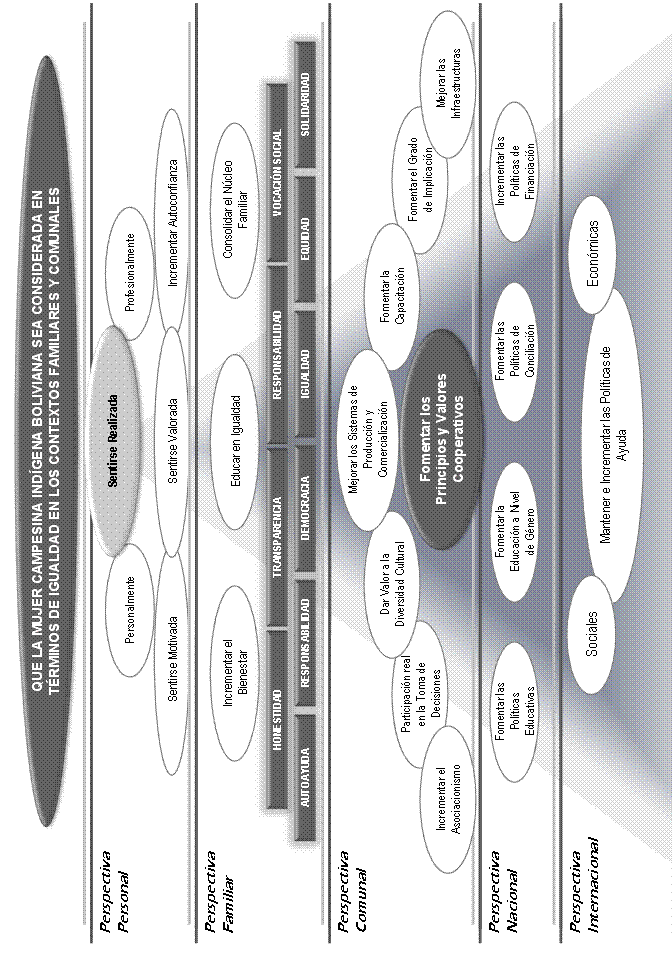 En este sentido, se ha planteado el mapa estratégico como una herramienta, cuya arquitectura de causa y efecto vincula a las cinco perspectivas de actuación propuestas (personal, familiar, comunal, nacional e internacional), y en las que de manera transversal, están presentes los principios y valores cooperativos, contribuyendo a la creación de valor y a la consecución de los objetivos y de la visión planteada: “Que la mujer indígena campesina boliviana sea considerada en términos de igualdad en los contextos familiares y comunales”, en definitiva, una mujer segura de sí misma, respetada por sus semejantes, capacitada, con voz y voto en la toma de decisiones y que consiga compatibilizar realmente su vida profesional y personal.