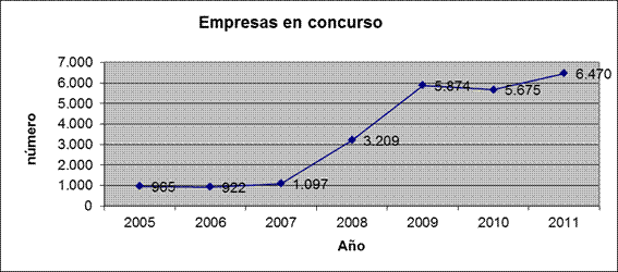 Este proceso se ha iniciado entre 2005 y 2007 por un número de empresas situado entre los 920 y 1.097 mostrando una reducción en el año 2006. En los años 2008 y 2009 el número de empresas en proceso concursal se multiplicó por más de siete, llegando a una cifra superior a las 5.800. Aunque en 2010 el número de empresas concursadas se redujo, en 2011 ha vuelto a aumentar alcanzando el valor máximo por encima de las 6.000 empresas concursadas (6.470).