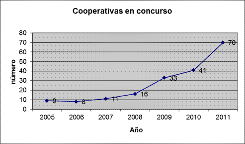 Por su parte, el número de cooperativas concursadas presenta una evolución similar hasta 2009, con una pequeña reducción en 2006, y elevados aumentos en 2008 y 2009 (ITURRIOZ y MARTÍN, 2010). No obstante, muestra una tendencia diferente en 2010, ya que mientras el número total de empresas concursadas se ha reducido, el de cooperativas se ha incrementado. En 2011, se ha recuperado la tendencia alcista en el caso del conjunto de las empresas concursadas, y se ha mantenido la tendencia creciente mostrada por las sociedades cooperativas concursadas de los años anteriores, aunque en este último año la pendiente es mayor. El peso porcentual de las cooperativas con respecto al total de empresas concursadas se mantuvo, en el período 2005 y 2007, entre el 0,87 por ciento y el 1 por ciento. Sin embargo, en 2008 y 2009 su peso se ha reducido a valores cercanos al 0,5 por ciento mientras que en 2010 se vuelve a incrementar hasta el 0,72 por ciento, y en el año 2011 dicho porcentaje se sitúa en el 1,08 por ciento.