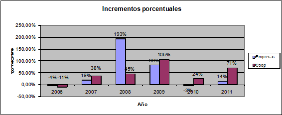 Analizando la tendencia de la evolución porcentual se observa que, desde 2007 a 2009, se han producido incrementos porcentuales tanto en el total de empresas como en el número de cooperativas mientras que en el 2010 el incremento sólo se mantiene en las cooperativas. No obstante, en el año 2011 se vuelve a recuperar la tendencia mostrada en los años anteriores. En el total de empresas destaca el incremento del 193 por ciento en el 2008, y del 83 por ciento en 2009 (esta última cifra indica un aumento del 1.422 por ciento con respecto a 2007) aunque la reducción porcentual del 3 por ciento en 2010 podría haber marcado un cambio de tendencia. No obstante, los datos del 2011 no confirman dicho cambio de tendencia, dado que el número de empresas concursadas en relación con las existentes en el año 2010 se incrementó en un 14 por ciento. En el caso de las sociedades cooperativas, en 2008 el aumento porcentual fue más reducido (un 45 por ciento frente a un 193 por ciento), aunque desde entonces el porcentaje de incremento en este tipo de entidades supera al del total de empresas. Por su parte, en 2010 el porcentaje incrementado es más reducido (pasa de un 106 a un 24 por ciento), sin embargo, en el año 2011 el incremento se sitúa en el 71 por ciento. Si se analiza la tendencia se puede observar que la reducción en el incremento porcentual del total de empresas se produjo en 2008, alcanzando un incremento máximo del 193 por ciento. Por su parte el cambio de tendencia en las sociedades cooperativas ha llegado un año más tarde. No obstante, las sociedades cooperativas concursadas no han reflejado la reducción que tuvo lugar en el año 2010 en el conjunto de empresas concursadas.