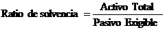 -          Ratio de solvencia. Tiene en cuenta el grado de cobertura del activo total en relación con el pasivo exigible, con lo que se analiza la distancia a la quiebra técnica (VARGAS, 2008). Lo deseable es que este ratio tome valores superiores a la unidad, dado que, cuanto mayor sea el valor del ratio más solvente será la sociedad cooperativa.