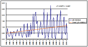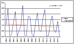 El fuerte impacto de la crisis iniciada a mediados del año 2007 nos lleva a preguntar si la tendencia del IA descrita puede estar influenciada por las cifras de los años de crisis. Para responder a esta cuestión, en el anexo recogemos los gráficos del IA dividiendo el periodo en dos subperiodos. Los gráficos de A-1 a A-4 recogen el IA de los trimestres correspondientes a 1995:1-2006:4 y los gráficos A-5 a A-8 los correspondientes al IA de los trimestres correspondientes a 2006:1-2013:2. De su análisis podemos destacar los siguientes aspectos.