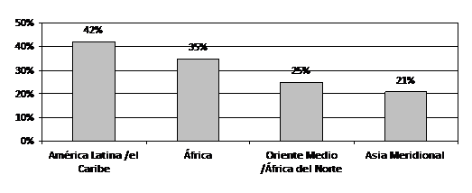 En relación a la tasa de cobertura, que es la relación entre las familias más pobres que recibieron un crédito y el total de familias que viven en la pobreza absoluta se puede observar que Asia Meridional es la única zona en que la tasa de cobertura guarda concordancia con el índice anterior (clientes en el umbral de la pobreza) con valores del  64% y un 56% respectivamente. La región de Asia Meridional es de hecho el único caso en el que ambos indicadores no muestran unas diferencias muy marcadas entre ellos, como sí lo es en las tres regiones restantes. En el caso de América Latina hay una diferencia de casi la mitad –con un 62% de clientes en el umbral de la pobreza y un 31,2% de tasa de cobertura-, lo que además es coherente con el valor del monto promedio de crédito que tiene esta región (USD 3.822). Ello se debe a que el acceso en América Latina está dirigido principalmente a pequeños y medianos empresarios, por lo tanto la gran mayoría de personas que se benefician no se encuentran en una situación de pobreza tan marcada, lo que inevitablemente limita la tasa de cobertura de la región. En cuanto a  África y Oriente Medio/África del Norte, siendo zonas donde se concentra la mayor tasa de pobreza extrema en el mundo, desafortunadamente tiene la tasa más baja con un 9,8%.