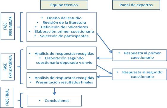 Nuestra intención es validar un conjunto de indicadores siguiendo la técnica Delphi. Los pasos que se van a abordar en el desarrollo del proceso aparecen recogidos en la figura 1. Como se puede observar en esta figura, una vez realizada la selección del panel de expertos, se les someterá a opinión sobre los indicadores propuestos. Tras una primera ronda, se llevará a cabo el análisis de las respuestas, depurando el cuestionario inicial y sometiéndolo a valoración en una segunda ronda ante los expertos. Tras ésta, se analizan las respuestas y se procederá a presentar unos resultados finales en los que se debe haber logrado el consenso, pero siempre con una gran autonomía por parte de los participantes. Los juicios intuitivos, con base en la experiencia, emitidos por el panel seleccionado, permitirán llegar a las conclusiones y validar de manera cualitativa las escalas propuestas para cada constructo.