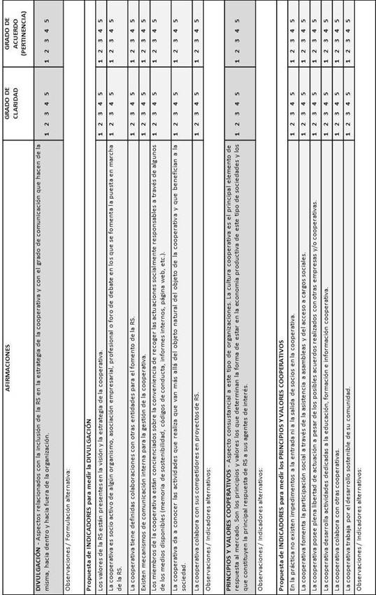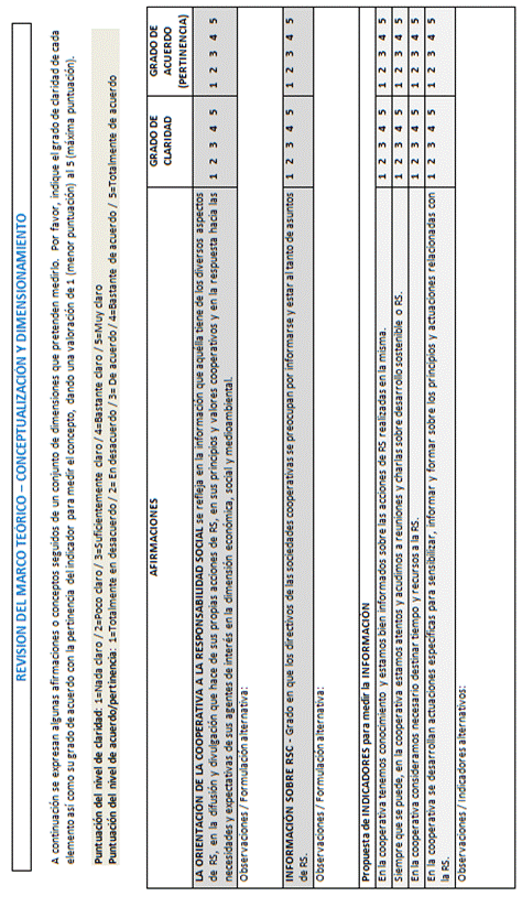 Precisamente, este último trabajo mencionado es el antecedente de la investigación que ahora presentamos. Así, antes de proceder con un análisis cuantitativo y con el fin de aprovechar las numerosas ventajas de un acercamiento real de los investigadores al objeto de estudio, se aborda la validación cualitativa por consenso de las escalas de indicadores definidos. Ello nos permitirá obtener, de profesionales expertos, información muy relevante en el ámbito cooperativo. A partir de ahí, tras dar por validada la escala que se presenta, se habrá cubierto el objetivo de este trabajo. Consideramos que el tema de la RSE y las cooperativas se va a enriquecer sin duda y tanto el ámbito académico como el empresarial cooperativo van a disponer de elementos en los que basarse para tomar sus decisiones sobre la inversión en acciones socialmente responsables.