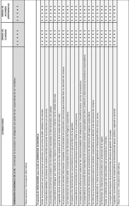 - Dimensión económica de la RSE: Para la definición de los indicadores incluidos dentro de la dimensión económica de la RSE hemos cubierto ampliamente varias áreas: a) por un lado, la preocupación por la entrega de productos y/o servicios a los clientes. Así, en base a Turker (2009), Lu et al. (2012), Agudo-Valiente et al. (2012) y Gallardo y Sánchez (2012), hemos observado la importancia de la calidad ofrecida, la satisfacción del cliente, la conformidad con estándares de calidad, ofrecer mejores precios que la competencia y ofrecer una amplia garantía. También se considera necesario proporcionar información completa a los clientes, así como considerar sus intereses en las decisiones empresariales y por supuesto el respeto a los derechos de los consumidores (Turker, 2009, Lu et al., 2012, Pérez et al., 2012, Gallardo y Sánchez, 2012); b) en segundo lugar, relacionado con los proveedores, se plantea el mantenimiento de relaciones estables mediante la introducción de proveedores responsables así como la consideración de sus intereses en las decisiones del negocio (Agudo-Valiente et al., 2012, Gallardo y Sánchez, 2012). En este sentido, no podemos olvidar ver cómo los proveedores gestionan a sus socios bajo principios éticos (Lu et al., 2012) y la existencia de un sistema de intercambio entre proveedores y clientes (Jiménez-Zarco et al. 2011, Gallardo y Sánchez, 2012), lo cual muestra la sensibilidad entre estos dos stakeholders clave en la cooperativa; c) finalmente, no podemos dejar de referirnos a la gestión de posibles quejas en la cooperativa (Turker, 2009, Perez et al., 2012, Agudo-Valiente et al., 2012, Gallardo y Sánchez, 2012) y el posible apoyo a nivel regional o nacional hacia los temas de RSE (Gallardo y Sánchez, 2012). Con todo ello, un conjunto de 18 indicadores recogen las situaciones incluidas bajo esta dimensión económica de la RSE.