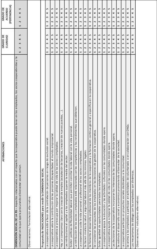 - Dimensión social de la RSE: Para la definición de los indicadores incluidos dentro de la dimensión social de la RSE hemos también analizado varios campos, todos ellos determinantes de unas condiciones de trabajo agradables y orientados hacia la preocupación de la empresa por el bienestar social en su conjunto. Hemos considerado algunos colectivos especiales separados de las organizaciones por razones de exclusión social y discapacidad (Gallardo y Sánchez, 2012). Una preocupación general a todos los niveles es mejorar la calidad de vida de los trabajadores y la creación de trabajo (Turker, 2009, Gallardo y Sánchez, 2012). El reconocimiento de la plantilla también es importante, su valor añadido para la organización basado en sus habilidades y los rendimientos obtenidos, lo cual determinará un mejor salario y la conciliación de la vida personal y laboral y mejores niveles de salud y seguridad respecto de los legalmente establecidos (Turker, 2009, Agudo-Valiente et al., 2012, Pérez et al., 2012, Lu et al., 2012, Gallardo y Sánchez, 2012). La promoción de la formación al empleado tiene un gran valor al considerar sus propuestas sobre la toma de decisiones del negocio (Turker, 2009, Gallardo y Sánchez, 2012), y por supuesto buscar la igualdad de oportunidades a todos los niveles (Turker, 2009, Pérez et al., 2012, Gallardo y Sánchez, 2012). A nivel social es muy importante la implicación en las actividades de la comunidad donde la cooperativa opera mejorando la calidad de vida, por ejemplo apoyando la educación, las actividades culturales (Lu et al., 2012, Pérez et al. 2012, Gallardo y Sánchez, 2012), incorporando los intereses en la comunidad en las decisiones de negocio y manteniendo una participación en proyectos sociales animando a los trabajadores para que colaboren en ellos (Turker, 2009, Pérez et al., 2012; Gallardo y Sánchez, 2012). Finalmente, es importante mantener un diálogo abierto con los empleados y crear planes de pensiones para su futuro (Gallardo y Sánchez, 2012). Las situaciones anteriores quedan reflejadas en un amplio conjunto de 19 indicadores.