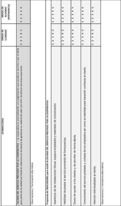 En este trabajo, se entiende la calidad del servicio como la visión global del usuario o cliente de la cooperativa sobre la excelencia o superioridad del servicio prestado por la misma. Para su medición, se empleará la escala SERVQUAL si bien solicitando al responsable de la sociedad cooperativa que evalúe tan solo sus percepciones sobre el servicio prestado, obviando las expectativas, tal y como proponen Cronin y Taylor (1992). Así, un conjunto de 5 indicadores se han definido para medir la calidad del servicio en la cooperativa.