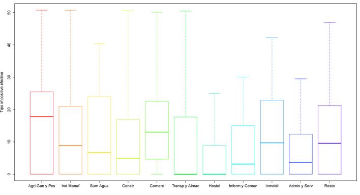 Además, como media del período analizado (2008-11) consideraremos los datos agregados de todos los años, utilizando también los de 2007 para obtener las variaciones. Por tanto, cada observación está compuesta en realidad por los datos agregados de cuatro años. Es decir, el tipo impositivo efectivo se ha calculado como el cociente de la suma de los impuestos pagados (según cálculo) en los años 2008-2011 y la suma del resultado antes de impuestos de estos años.