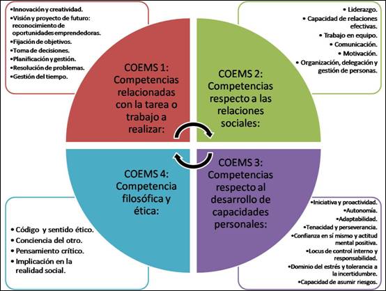 Según lo considerado en la literatura, cuatro son los bloques donde se deben fomentar competencias que permitan desarrollar al alumnado en su globalidad, para lograr fomentar un perfil emprendedor, con una clara impronta social, COEMS. Estos cuatro bloques responden a: competencias relacionadas con la tarea o el trabajo a realizar (COEMS 1); a construir relaciones con los demás (COEMS 2); a desarrollar las capacidades personales e individuales (COEMS 3); y a fomentar la faceta filosófica y ética (COEMS 4).