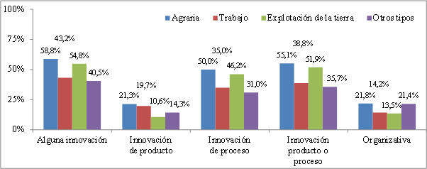 Dentro del comportamiento innovador del conjunto de las cooperativas se detectan algunas diferencias entre las distintas clases de cooperativas (Figura 2). En todos los tipos de innovación considerados, las entidades que se muestran más dinámicas son las cooperativas agrarias, que realizan algún tipo de innovación en el 58,8% de los casos; seguidas de las cooperativas de explotación comunitaria de la tierra y/o el ganado. En el extremo opuesto, destaca el reducido valor que alcanzan las cooperativas de explotación de la tierra para el caso particular de las innovaciones de producto, donde apenas el 10,6% de las organizaciones reconocen haber generado innovaciones, mientras que estas mismas cooperativas son las que innovan con intensidad en sus procesos, un 46,2% de las organizaciones llevan a cabo innovaciones de esta naturaleza. En general, las cooperativas llevan a cabo innovaciones incrementales frecuentes en sus procesos productivos mientras que las mejoras en productos son más infrecuentes.