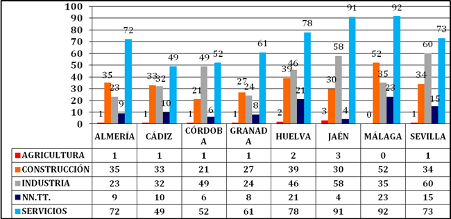 Por provincias, Málaga es la que mayor número de Sociedades Laborales posee en el sector servicios con un total de 92 (16,20%) y en el de Construcción (52), mientras que Sevilla es la provincia que más Sociedades Laborales posee en industria (60) y la tercera en nuevas tecnologías con 15 (15,62%). Por otra parte, Jaén es la provincia más representativa en el sector de Agricultura con 3 sociedades (30%).