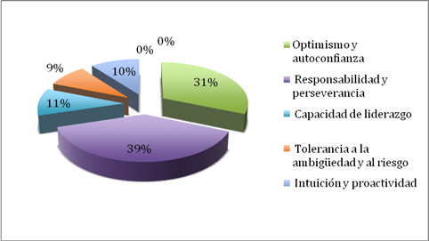 El 39,05% de los emprendedores en sociedades laborales se manifiestan como responsables y perseverantes. En segundo lugar, se consideran optimistas y con suficiente autoconfianza en su actividad y sus posibilidades (31,27%). Por su parte, el 10,66% se considera con capacidad de liderazgo, encontrando cifras similares en cuanto a la intuición o perspicacia y la proactividad (10,37%). Por último, se comprueba como tan sólo un 8,65% de los emprendedores en sociedades laborales tolera cierta ambigüedad y riesgo.