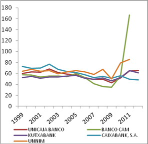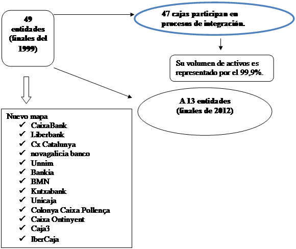 - Se generó una gran disminución del número de cajas de ahorros, pasando de 49, a principios de 1999, a tan solo 13 grupos a finales de 2012.