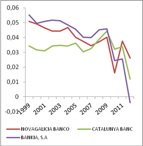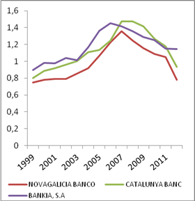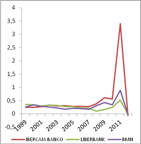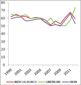 En el gráfico 2 se observa cómo, en el caso de BMN, hay una mejora de la eficiencia a partir del SIP que se produce en 2010, aunque su situación no ha variado mucho, con un registro de 57,87% en 2010 y un 66,01% en 2011; y en Ibercaja también ha mejorado a partir del SIP del Banco Caja 3 y el traspaso del indirecto de Ibercaja a Ibercaja Banco producido a principios del 2011.