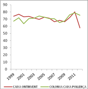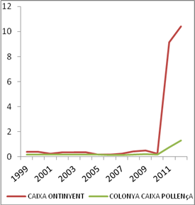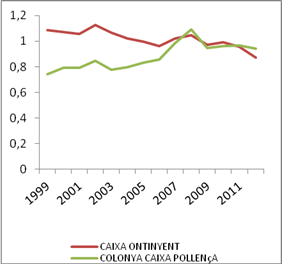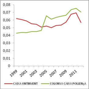 Para terminar con el análisis de la brecha financiera se pasa a estudiar aquellas entidades que no han experimentado ningún proceso de integración, como es el caso de Caixa Ontinyent y Caixa Pollença. Ambas cajas parten de niveles distintos de brecha para terminar el período con un nivel muy parecido, siendo algo superior el de Caixa Pollença.