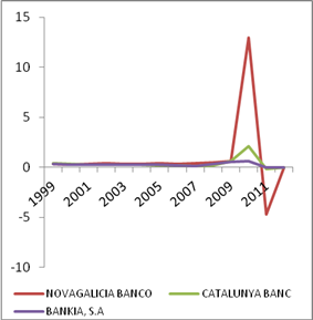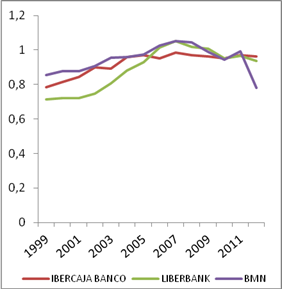 Por una parte, Kutxabank, Caixabank y Unicaja banco que han tenido una mejora respecto a la solvencia a lo largo del período estudiado, a pesar de que dicha ratio se reduce en el año 2011 para el caso de Unicaja Banco. Kutxabank destaca, como la entidad que mejor solvencia posee en este grupo, lo que puede ser consecuencia del SIP producido entre 2010 y 2011, por lo que podemos decir que el proceso de fusión por SIP ha sido muy favorable para esta entidad, habiendo pasado de tener un nivel de solvencia de 0,08 en 2009 a 0,14 en 2012. El caso de Caixabank también es destacable por haber ido aumentando a lo largo de los años, ya que es uno de los tres únicos bancos participados por las cajas de ahorros que tienen sus necesidades cubiertas de capitalización y no necesita ayudas públicas.