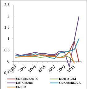 Por otra parte, destaca el caso de Banco CAM y Unnim, cuyos niveles de solvencia han ido disminuyendo progresivamente a lo largo de los 13 años analizados. Lo anterior fue una de las causas para que dichas entidades fueran integradas en diferentes bancos. En el Banco Sabadell en el caso del Banco CAM y en el BBVA en cuanto a Unnim Banc se refiere.
