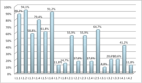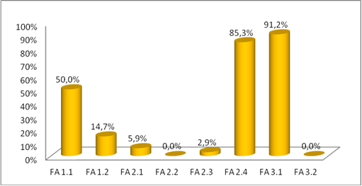 La última de las dimensiones a evaluar muestra un comportamiento más o menos similar al resto. Los datos respecto a la política de privacidad (FA1.1) o aviso legal (FA1.2) son de 50% i 14,71% respectivamente. La segunda se considera una cifra bastante baja, ya que un porcentaje importante de webs tienen un acceso a clientes o socios en el que se tienen que registrar, y no tener la seguridad de cumplir con la ley de protección de datos es inadecuado.