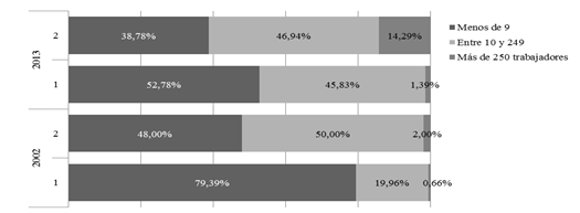 El resultado del proceso de recopilación de los datos necesarios para ambos períodos, puso en evidencia un descenso del tamaño muestral (514 empresa en el año 2002, frente a 121 empresas en el año 2013). Se supuso que tal descenso obedecía a los diferentes procesos de captación de datos empleados; al hecho de que algunas empresas que integran la muestra en el año 2002 habían desaparecido en el 2013 y a la menor cuantía de recursos económicos disponibles para hacer la investigación (la investigación del año 2002 se financió con fondos para la investigación, y la del 2013 se realizó con recursos propios).