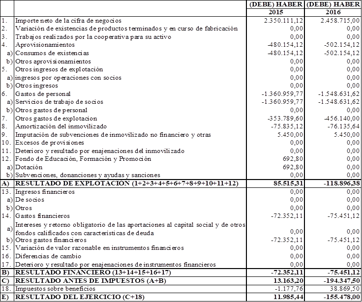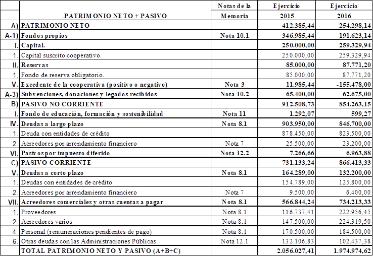 En lo que concierne al patrimonio neto de la sociedad, ha sufrido un considerable descenso, debido a las pérdidas acumuladas en la cooperativa durante el periodo del 1 de enero al 15 de mayo de 2016. Dichas pérdidas se corresponden a un incremento de gastos de personal en la empresa y de los servicios exteriores. Estas pérdidas, al resultar de la gestión diaria, resultan cooperativas, y, por lo tanto, son imputadas un 50% al Fondo de Reserva Obligatorio, y el otro 50%, al patrimonio de los socios.