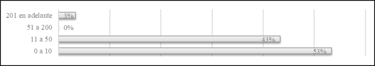 Finalmente, el número de asociados es un parámetro utilizado para determinar la dimensión de las cooperativas, y se transforma en un factor clave de éxito en la medida en la cual se le permita participar en la gestión de la institución solidaria; en el contexto de las cooperativas de ahorro y crédito de Barranquilla, los resultados de muestran que el 53% que integró la muestra se encuentra en un rango de 0 a 10 asociados, mientras que el 43% manifestó encontrarse en el intervalo de 11 a 50. Es importante demarcar, que solo el 3% declaró que sus socios sobrepasan los 201 (Ver gráfico 11).