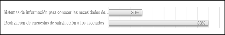 El último factor clave de éxito determina que existen en las instituciones solidarias utilizadas estrategias que garantizan la permanencia de los asociados en las cooperativas; de hecho, a partir de los resultados se infiere que el 80% de las cooperativas de ahorro y crédito de Barranquilla, los sistemas de información se constituyen en herramientas para determinar las necesidades de los agentes de mayor vulnerabilidad de la sociedad, mientras que el 83% utiliza las encuestas de satisfacción para lograr estos objetivos (Ver gráfico 12).