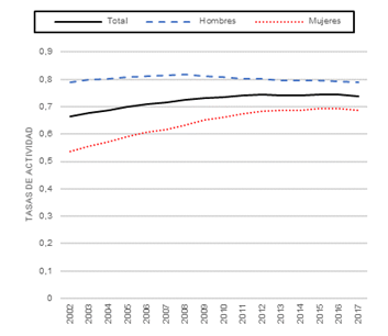Aunque en España se ha incrementado notablemente la actividad laboral de la mujer en los últimos años, ésta sigue estando por debajo de la masculina y del total nacional (ver GRAFICO 1). Al contextualizar estas cifras en el entorno europeo, aunque la actividad de las mujeres españolas se sitúa en torno a la media (67,84%), si se compara con países como Suecia (81,42%) o Finlandia (76,64%) sigue siendo baja, sobre todo si se tiene en cuenta que en estos países la población femenina es mucho más reducida que en España (15.242.4000 frente a 3.071.700 y 1.701.000, respectivamente).