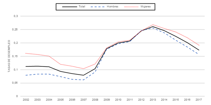 En definitiva, los datos ponen de manifiesto que la crisis ha provocado cambios estructurales significativos en el mercado laboral español. Si antes de este fenómeno la tasa de desempleo masculina representaba prácticamente la mitad del desempleo femenino; la dinámica ha tendido a disminuir estas cifras, hasta llegar a unas diferencias mínimas (ver Gráfico 2). Los datos demuestran que el desempleo ha aumentado en ambos géneros, pero la variación de las tasas femeninas ha sido más gradual y las masculina se triplicaron entre 2007-13.