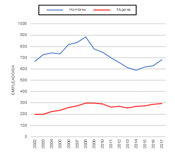 Como se observa en el Gráfico 1, en lo referente a actividad y ocupación, la crisis ha reducido la brecha de género en los últimos años. En el caso de la actividad, la equiparación de las cifras se debe al incremento de las tasas femeninas y el mantenimiento de las masculinas, que apenas se han modificado durante el periodo estudiado. En cambio, las tasas de ocupación de los hombres españoles si han sufrido más oscilaciones, destacando su reducción durante el periodo 2007-13 (disminución del 20%). La crisis ha afectado con mayor intensidad a sectores tradicionalmente masculinizados, como la construcción. Debido a ello, se ha generado una mayor destrucción de empleo masculino y se han reducido las diferencias de género en lo relativo a la ocupación.