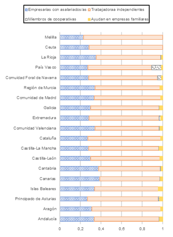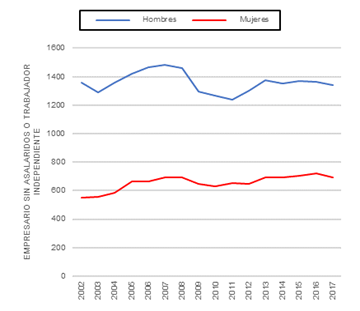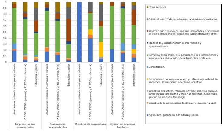 También se ha podido observar un aumento de la presencia de emprendedoras en el sector de la Administración Pública, la educación y la docencia, lo que puede deberse a una extensión del rol reproductivo o de cuidado asignado tradicionalmente a la mujer. Por otro lado, el estudio de los datos pone de manifiesto una fuerte especialización en ciencias sociales, como avala el hecho de la concentración de empresas femeninas en actividades relacionadas con la intermediación financiera, los seguros, las actividades inmobiliarias y los servicios administrativos, científicos y profesionales. Además, en comparación con el colectivo masculino, destaca el elevado número de mujeres que ayudan en empresas o negocios familiares, lo que manifiesta el mayor desempeño de labores auxiliares o de apoyo por parte del colectivo femenino.