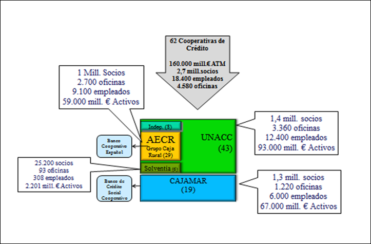 De este modo, la banca cooperativa en España comprende a un conjunto de 62 cooperativas de crédito que vinculan a más de 2,7 millones de socios y cerca de 11 millones de clientes. En términos económicos alcanzan un activo de 140.000 millones de euros, con una cuota del 6,75% de los depósitos y el 6,1% de los créditos, empleando a casi 20.000 personas en una amplia red de 4.600 oficinas. El sector incluye, tanto a las cajas rurales (aproximadamente el 80% del sector por dimensión de los activos), como a las cajas populares y profesionales[4].