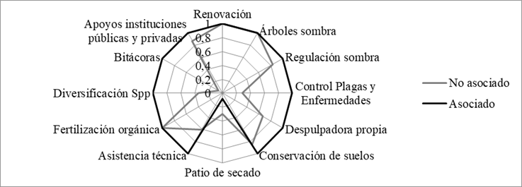 Se observó una brecha en el IS de los productores de 0,63 (Figura 8), lo cual refleja la existencia de productores cuya forma de producir es sostenible y otros que no. Finalmente, estableciéndose dos grupos: productores en clasificación sostenible (Índice ≥ 0,5) e insostenible (< 0,5), con una prueba X2 de Pearson se demostró que existe relación entre estar asociado y la sostenibilidad del sistema (P<0,01) y que el 14,8% de no asociados en la cooperativa están en calidad de sostenible, mientras, que en los agremiados fue el 100 %, situación relacionada con la obtención de sobreprecios, acceso a innovaciones tecnológicas y a capacitaciones constantes (Figura 9).