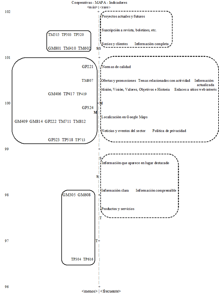 En la zona izquierda de la Figura 2, donde se posicionan la mayor parte de las cooperativas, su rango de distribución se solapa parcialmente con un área del rango de jerarquía de los indicadores en la parte derecha (en concreto nueve). La media (M) para las cooperativas es ligeramente menor que para los indicadores y el área de los indicadores difíciles de encontrar en los sitios Web corporativos está por encima del área de los parámetros del rasgo latente de las cooperativas, delimitado por la desviación típica (S). Esto indica que las cooperativas no incorporan dos indicadores de la calidad de la información (proyectos actuales y futuros, y suscripciones a revistas, boletines, etc.) y hay tres cooperativas de la provincia de Santa Cruz de Tenerife creadas en los años 70 (dos pequeñas y una mediana) que se sitúan por encima del resto de indicadores.