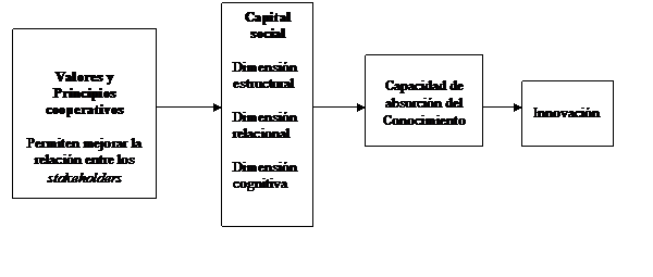 Según el modelo teórico propuesto, el cumplimiento de los principios cooperativos posibilita la generación de capital social en la sociedad cooperativa, el cual influye en la capacidad de absorción de la organización –identificación, asimilación, transformación y explotación del conocimiento externo–, y por ello en la innovación.