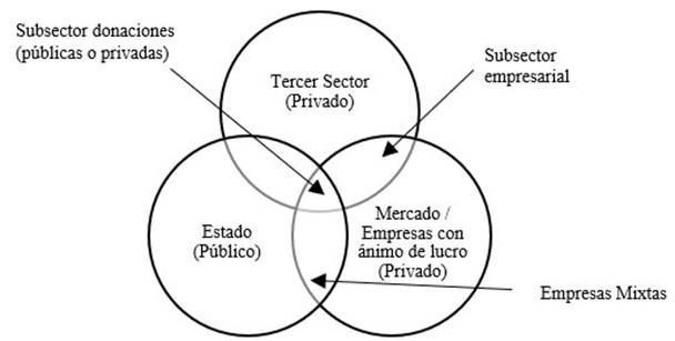 Para su mayor comprensión, se realiza precisión sobre algunos de los términos empleados y la manera en cómo serán abordados en este artículo. Se da como elemento inicial la clasificación de los tres sectores y sus interrelaciones, expuesta por el Centro de tecnología para el desarrollo (CENTED) (2007) tal como se expone en el gráfico 1: el estado, el mercado y el tercer sector. Allí, se define el mercado como todas aquellas organizaciones, comercios, empresas, personas o individuos que desarrollan una actividad profesional, comercial, industrial, de producción o de servicios, que tienen por finalidad generar un excedente económico para su propio beneficio (Guerra, 2014); el estado con sus órganos de gobierno con sus funciones en el legislativo, ejecutivo y judicial; y el Tercer Sector que en muchas ocasiones es definido por un criterio de exclusión o lo que no es, como por ejemplo las organizaciones que no hacen parte del estado ni del mercado o las organizaciones sin fines de lucro. Este sector tiene particularidades que hacen compleja su identificación y definición. Sin embargo, es un actor que en las últimas décadas ha ido desarrollando procesos de afirmación y constitución como actor social (Elizalde, 2016). Según Donati (1997), el tercer sector es visto como un “tercer punto de vista” que busca prescindir del valor “Holístico” del Estado y el “liberal” del mercado. Donati, sigue los preceptos de Jerez y Revilla Blanco (1998), en el que agrupa dentro del tercer sector todos los actores que, socialmente, no pertenecen al sector estatal ni al sector privado o de mercado. El tercer sector es visto como un espacio heterogéneo y diverso por la cantidad de actores que pueden clasificarse allí tales como organizaciones no gubernamentales, corporaciones, negocios sociales, asociaciones, cooperativas e instituciones sin ánimo de lucro (Garkisch et al., 2017). Ahora bien, se explican entonces las intersecciones de los círculos, teniendo en cuenta los dos subgrupos planteados por Monzón (2006), el subsector empresarial, cuyos recursos provienen del mercado, incluyendo allí las cooperativas y algunas empresas sociales. Y, de otra parte, el subsector que obtiene sus recursos por parte de donaciones de manera pública o privadas, rentas o cuotas de socios, en las cuales se incluyen cooperativas, fundaciones, ONG o entidades sin ánimo de lucro (ESAL)[4]. La intersección que corresponde al estado y al mercado, corresponde a la formación de empresas mixtas que son aquellas que cuentan con aportes de capital público y privado. El gráfico 1, muestra el relacionamiento que existe entre ellos y en donde algunas organizaciones cumplen criterios para pertenecer a dos o más sectores.