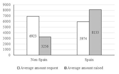 On the other hand, regarding location, the results show that in projects located outside Spain, the average amount raised is lower than the average amount requested, whereas, for projects located in Spain, the average amount collected exceeds the average amount requested. This shows the important role that the location of the project plays in obtaining greater financing from locally based investors.
