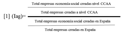 Para mapear la posible existencia de clusters de empresas de economía social, se utilizó el índice de especialización territorial o aglomeración (Iag), siguiendo el método de Staber (2001) y de Cromley y Hanink (2012), tal como se muestra en la ecuación [1]. El sentido de este indicador es valorar la presencia de un perfil de empresa en un espacio determinado (CA: Comunidad Autónoma) con respecto al total de España. Así, cuanto mayor es el índice, mayor importancia relativa tendrá el emprendimiento en empresas de economía social respecto al total en esa autonomía con respecto al mismo indicador para el global de España. Para nuestro caso, cuanto más próximo a cero sea dicho indicador, menos relevante es el carácter emprendedor basado en economía social.