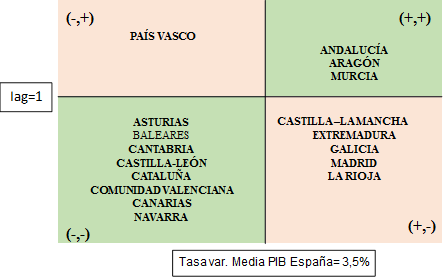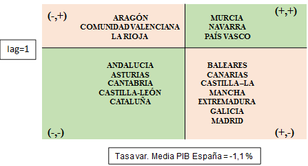 Si se relaciona el coeficiente de localización con la tasa media de crecimiento del PIB se obtienen los gráficos 4 y 5. Estos gráficos establecen una ordenación en cuatro grupos: Iag>1 con tasa de variación media del PIB inferior a la media estatal (-,+); el caso contrario con Iag<1 y tasa de variación superior a la media estatal (+, -). Y las casillas donde coinciden, ya sea de manera positiva o negativa el Iag y la tasa de variación media del PIB [(+,+) y (-,-)].