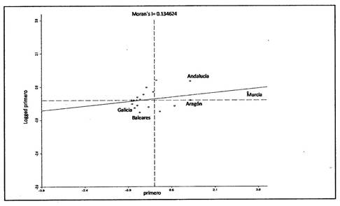 En el análisis LISA (índice de Asociación Local) se evidencia que en el período 2002-2007 sólo se constatan aglomeraciones espaciales de empresas mercantiles ya que no hay ninguna comunidad autónoma con un índice de agrupación superior a 1 y cuyos vecinos tengan rangos semejantes o superiores a este valor, por lo que el proceso emprendedor en economía social tiene el carácter de concentrado espacialmente. Para empresas mercantiles tiende a ser difundido, ya que existen 6 regiones cuyas comunidades vecinas toman valores del índice de agrupación en el mismo rango de valor (Iag inferior a uno).