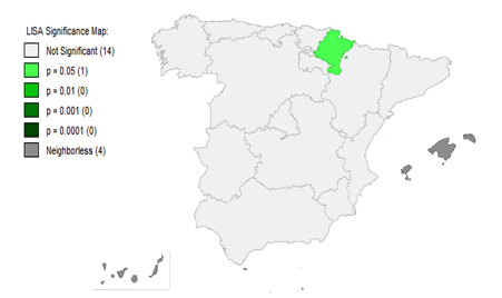 Dicho de otro modo, se produce un punto hot spot cuando un territorio se encuentra rodeado de territorios con peso similar para el indicador (Iag) y tienen índice de Moran igual o muy próximo a cero. Esto indica que no existe autocorrelación espacial y que la existencia de este punto hot spot no es más que consecuencia de un proceso aleatorio, más relacionado con cuestiones del entorno que realmente por la capacidad de difundir comportamientos emprendedores hacia territorios vecinos. Por ello, es conveniente interpretar el dato desde la perspectiva de difusión del espíritu emprendedor en economía social desde las comunidades vecinas, que evidencian tradición en este tipo de empresas, hacia un territorio sometido a las dificultades que genera la crisis y que busca en estas empresas una forma de poder defenderse de la situación y generar autoempleo.